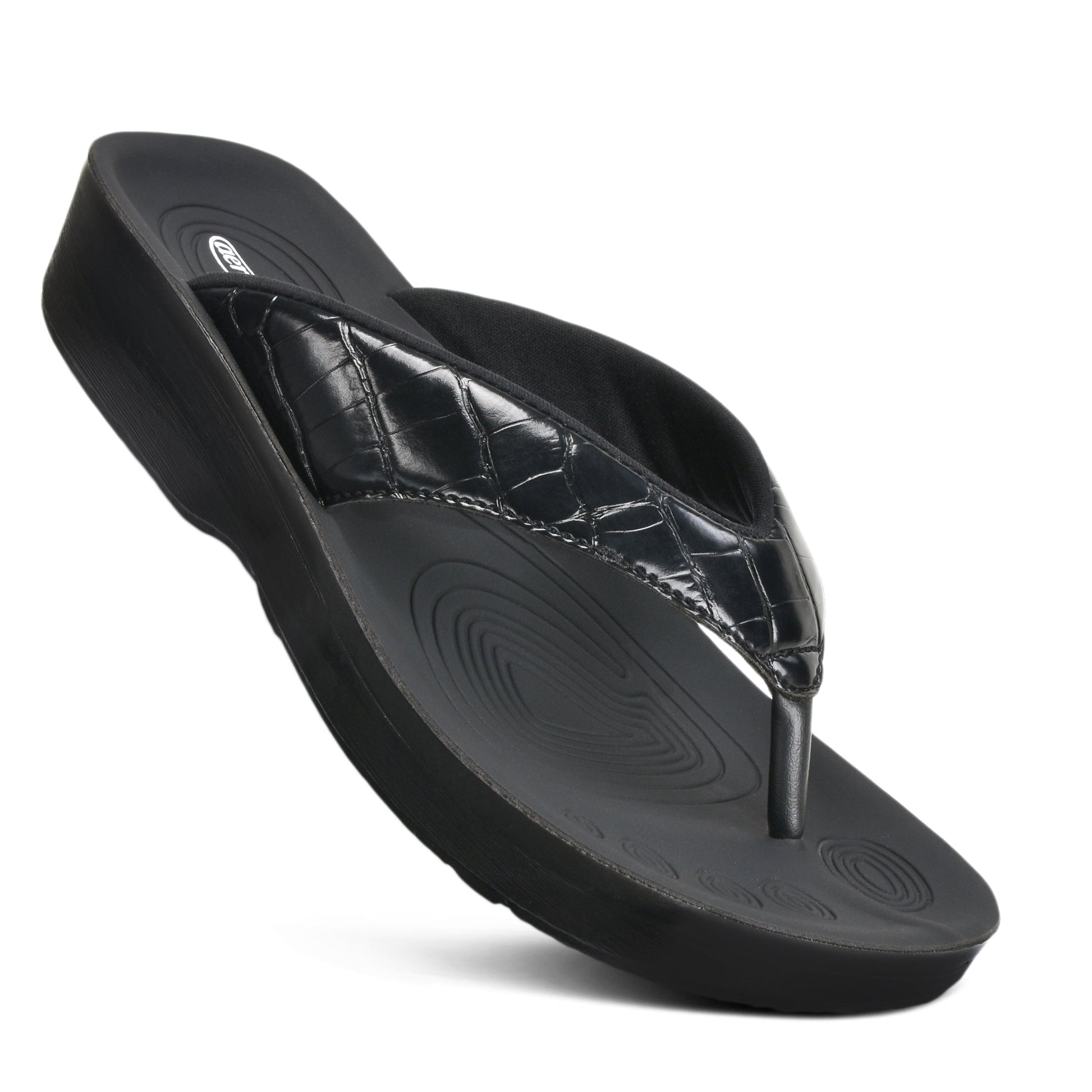 Upgrade your summer style with the Felice arch support casual women's flip flops! The padded strap, featuring a glossy croc-textured upper, offers a snug fit that gently hugs your foot, while the ergonomic PU footbed provides exceptional arch support, molding to the contours of your feet with each step. Whether you're lounging by the pool or staying active throughout the day, these sandals are perfect for any laid-back outfit, as they combine style and comfort. Felice is a must-have for your everyday wardrobe.